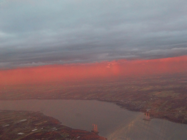 一つ目は夕焼けのケベックシティです。機内からの写真ですが、夕焼けを上から見るのって初めてでした!!